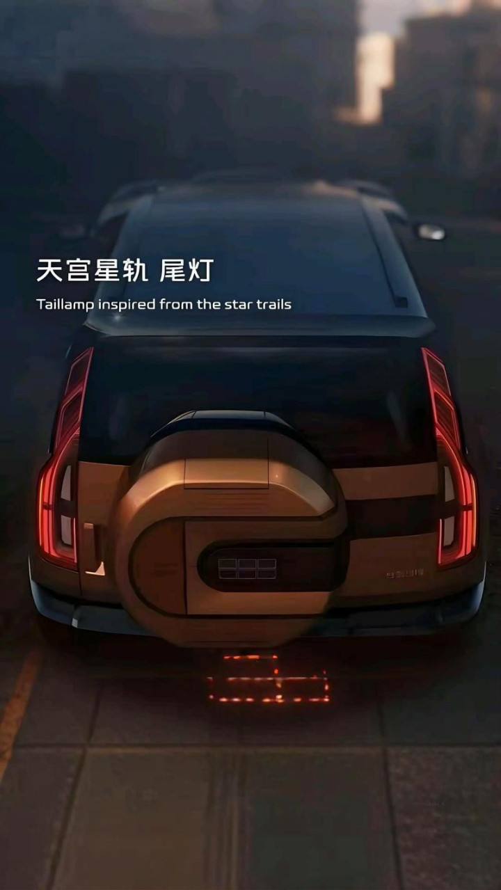 车辆前大灯设计灵感源自古代“浑天仪”,尾灯则勾勒出“天宫星轨”图案,将中国传统文化元素融入硬派设计语言。